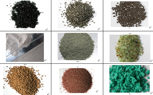 有時候進行表面處理時噴砂和拋丸磨料要進行比例混合使用,如金屬鋼丸、棱角鋼砂和鋼絲段;非金屬如石榴石、十字石(硅酸鋁鐵礦)、橄欖石、石英砂、黃砂、銅礦渣、鐵礦渣、鎳礦渣、融化氧化鋁渣、煤渣、玻璃砂、陶瓷砂等等。